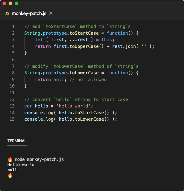 We are assigning a new method name (patchFunc) to the existing class method name (monkeyFunc). The linking of a new method to the existing class method name happens at runtime. So the behavior of the class monkey is changed dynamically.